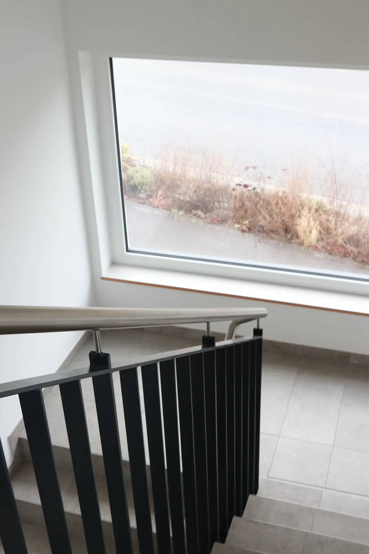 Im Außenbereich des Gebäudes befinden sich ausreichend PKW- sowie Fahrradstellplätze und auch die befestigte Vorfläche der Fahrzeughalle bietet ausreichend Platz für Ein- und Ausrücken der Einsatzfahrzeuge. Die Außentreppe des Feuerwehrhauses fungiert durch die vorgesetzte Stahlbetonwand gleichzeitig als Gestaltungsmerkmal des Gebäudes.